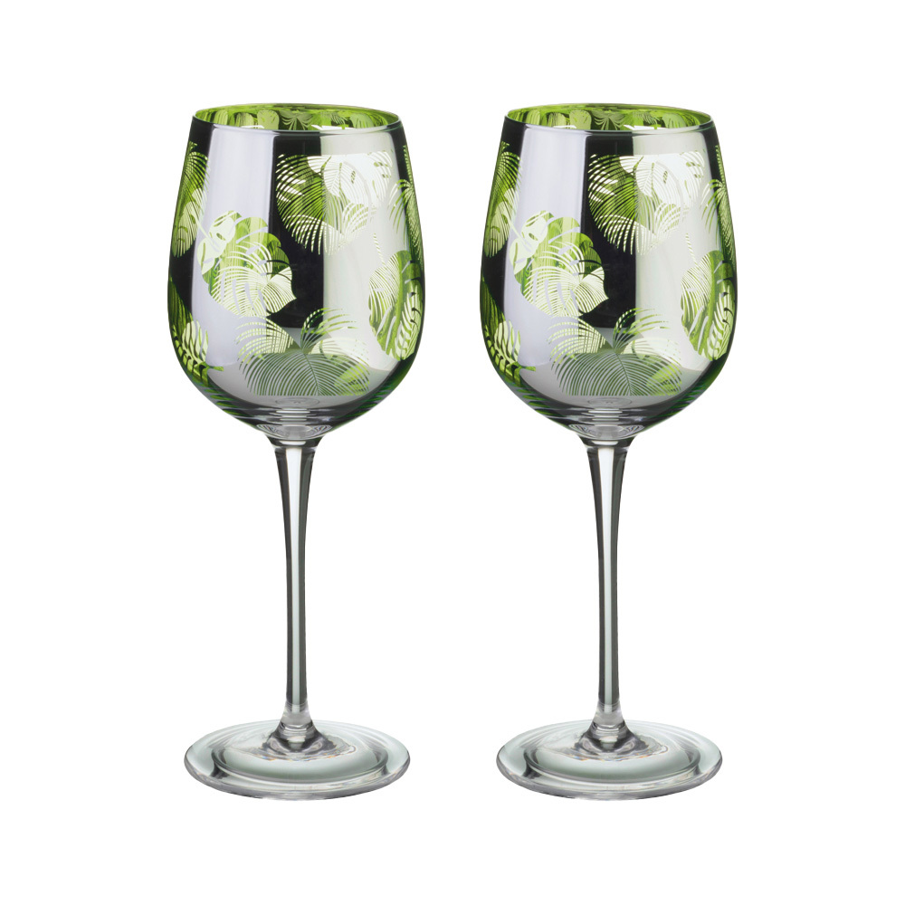 Artland Tropical Leaves Wine Glass Set of 2 - 90x90x235mm/45cl Artland’s Tropical Leaves range is exotic in more ways than one! There is a huge amount happening within each mouthblown glass. The outside of every bowl has a mirrored silvered finish, which then has lasered out a rich foliage of leaves most commonly found in the rainforest! These leaves are made richer still by the soft green metallic finish which glows through the lasered out leaf silhouette and really makes the it stand out from the silver. Alongside the five drinking glasses in the range, being a wine glass, gin bowl, champagne saucer, martini glass and tumbler. Dimensions: 90 x 90 x 235 mm Stunningly designed glass with a mirrored silvered finish outside and a green metallic on the inside Decorated with Tropical leaves all the way around the bowl of the glass Mouth blown and hand crafted by skilled craftsmen Hand wash recommended Designed by Artland