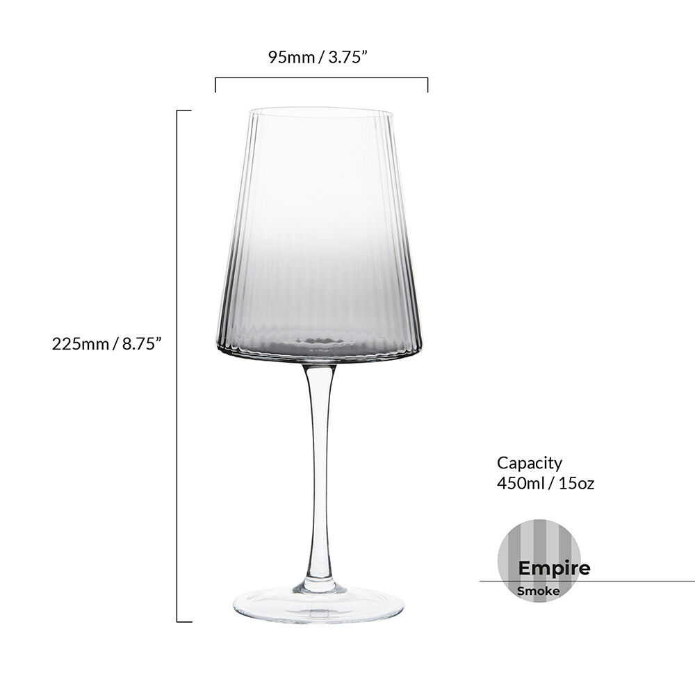 ASD10371 ASD EMPIRE WINE SMOKE (SET 2) Anton Studio Designs’ Set of 2 Empire wine glasses is highly sophisticated! Mouth blown and hand crafted, the bowls of each glass have a modern shape with a flat base, rounded corners, and angled sides which taper inwards. All this is brought to life and made even more stunning still by the complementary, fine, vertical optic which runs up and down each bowl. The carefully chosen warm amber and rich smoke colours have been applied in such a manner that the colour creeps up the bowl, fading as it rises, finally exposing nothing but its thinly layered optic. This ombre effect gives a beautiful blend of colour and class, which lends itself perfectly to the distinguishable Empire shape. Gift boxed in pairs of matching colours, smoke and amber Empire is available in wine and gin glasses, along with the DOF tumblers. Contemporary shaped bowl with rounded corners and a fine optic Fine amber ombre effect Mouth blown and handmade by skilled craftsmen Hand wash recommended Designed in the UK Dimensions: 95 × 95 × 225 mm Capacity: 45 cl Colour: Smoke grey, Clear Substrate: Glass