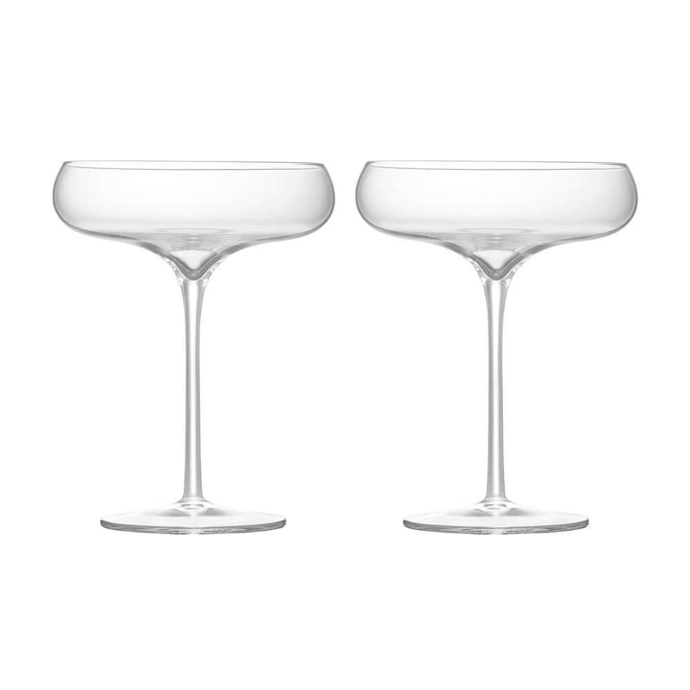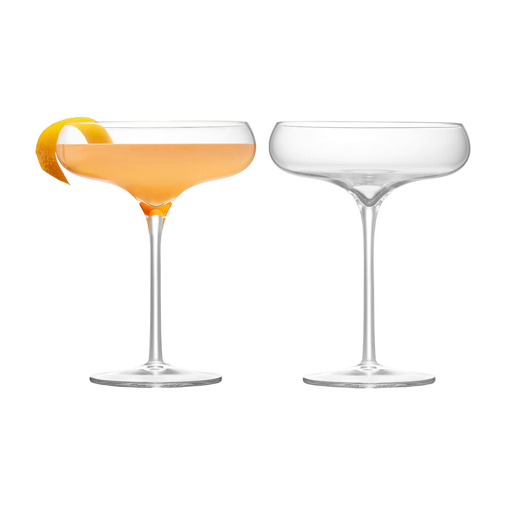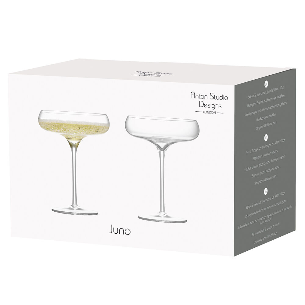 ASD10417 ASD JUNO CHAMPAGNE SAUCERS SET OF 2 Juno was designed to blend the familiar with the modern. The bowls, broad and graceful, taper delicately for a silhouette that is both inviting and elegant. Throughout the range, each piece echoes this design in a subtly different way, creating a cohesive collection with a striking silhouette. Stemmed glasses in the Juno collection are further distinguished by the way the stems are pulled directly from the bowl, creating a delicate teardrop dimple at the base of each piece. Contemporary shaped bowl with rounded corners Pulled stem with teardrop dimple Mouth blown and handmade by skilled craftsmen Hand wash recommended Designed in the UK Weight: 130 g Dimensions: 120 × 120 × 155 mm Colour: Clear Capacity: 30 cl Substrate: Glass
