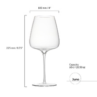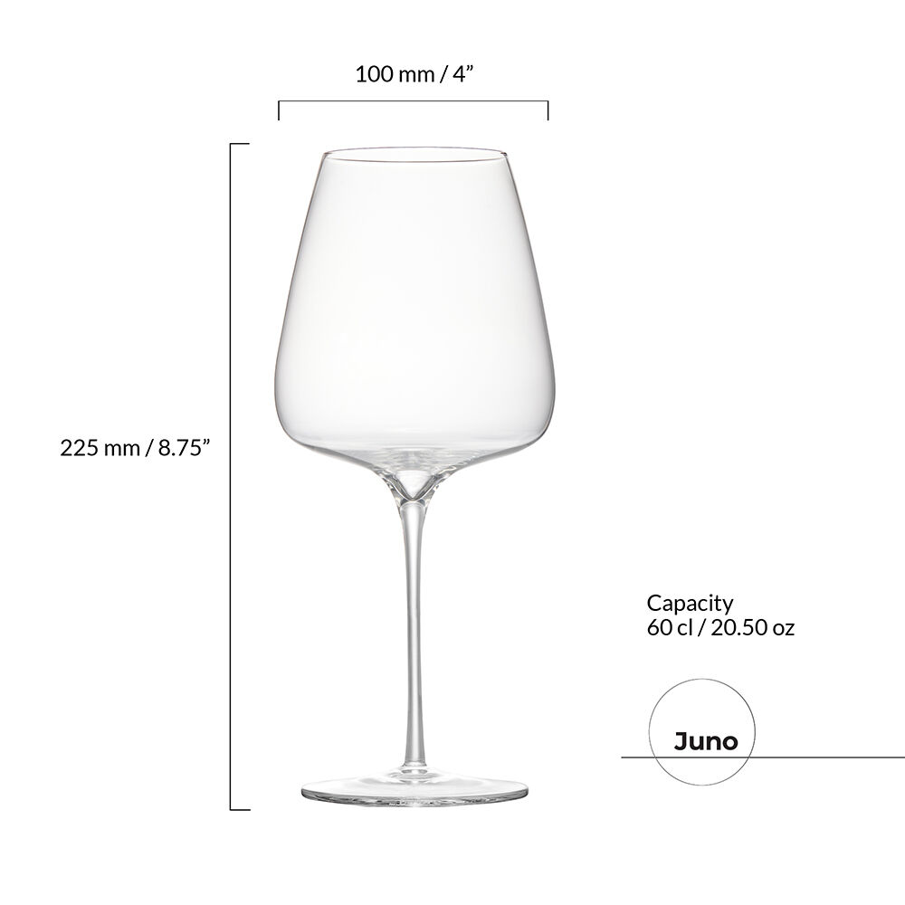 ASD10414 ASD Juno Red Wine Glasses SET OF 2 Juno was designed to blend the familiar with the modern. The bowls, broad and graceful, taper delicately for a silhouette that is both inviting and elegant. Throughout the range, each piece echoes this design in a subtly different way, creating a cohesive collection with a striking silhouette. Stemmed glasses in the Juno collection are further distinguished by the way the stems are pulled directly from the bowl, creating a delicate teardrop dimple at the base of each piece. Contemporary shaped bowl with rounded corners Pulled stem with teardrop dimple Mouth blown and handmade by skilled craftsmen Hand wash recommended Designed in the UK Weight: 130 g Dimensions: 100 × 100 × 225 mm Colour: Clear Capacity: 60 cl Substrate: Glass