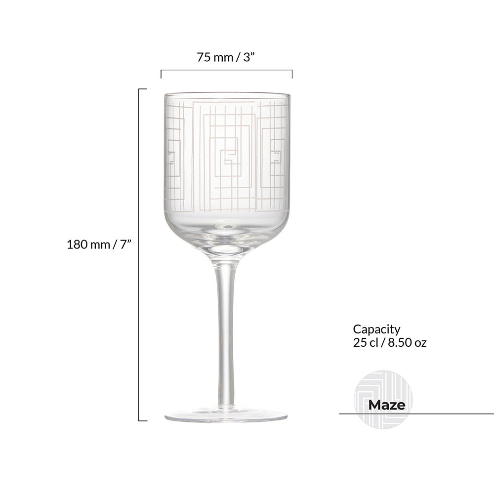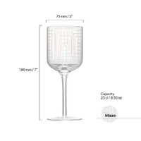 ASD10195 ASD MAZE WINE GLASSES SET OF 2 The Maze collection stands out with its distinctive textured decal, adding both visual intrigue and a tactile experience to each glass. The labyrinth style straight line pattern perfectly suits the silhouette of the glasses themselves. Comprising four essential pieces – champagne flutes, wine glasses, gin glasses, and DOF tumblers – this collection is as functional as it is stylish. The raised detail adds dimension to the sleek, contemporary forms, giving the glasses a unique aesthetic without compromising on their clean lines. Each piece in the Maze collection is gift-boxed in pairs. Modern shapely bowls Decorated with a tactile, maze design Mouth blown and handmade by skilled craftsmen Hand wash recommended Designed in the UK Weight: 135 g Dimensions: 75 × 75 × 180 mm Colour : Clear, White Capacity: 25 cl Substrate: Glass