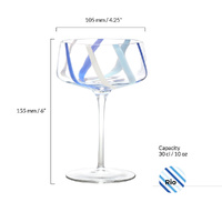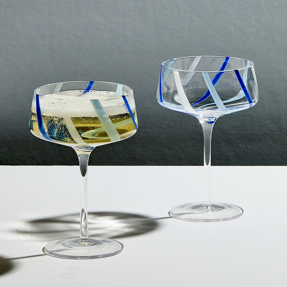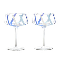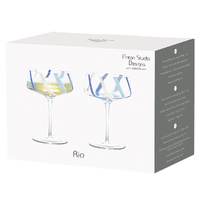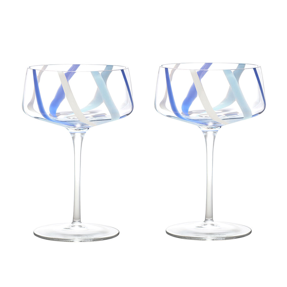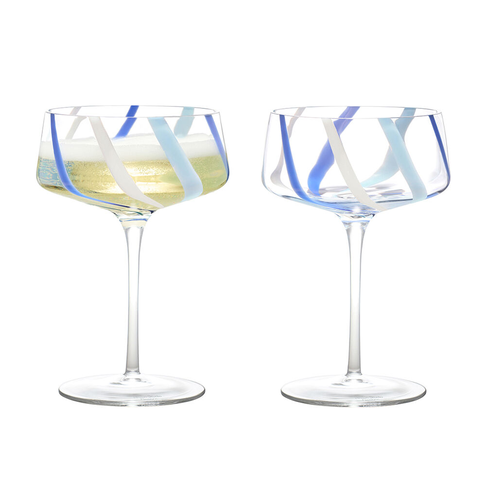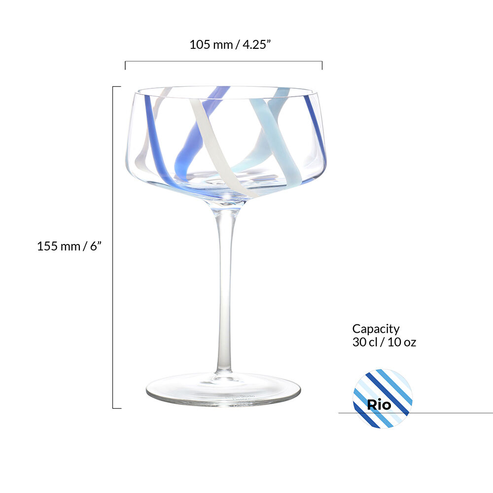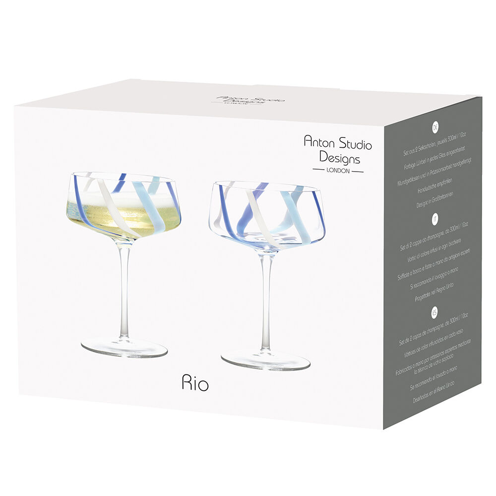ASD10206 ASD Rio Champagne Saucers Azure Set of 2 From the vibrant colours flowing through the bowl to the sleek, sophisticated shapes, the Rio collection embodies modern design with a playful twist. Available in two striking colourways – Azure and Citrus – each piece features bold, hand-applied colour bands that wrap diagonally around the glass, creating a sense of movement and energy. With tall, angled bowls that taper elegantly inward, the collection includes wine glasses, gin glasses, champagne coupes, and DOF tumblers. Each set is gift-boxed in pairs, making them perfect for gifting or adding a fresh pop of colour to your collection. Swirls of colour infused into each glass Well-rounded bowls with, long elegant stems Use it as a centrepiece, wall ornament, or on a sideboard. Mouth blown and handmade by skilled craftsmen Weight: 145 g Dimensions: 105 × 105 × 155 mm Colour: Blue Clear White Capacity: 30 cl Substrate: Glass