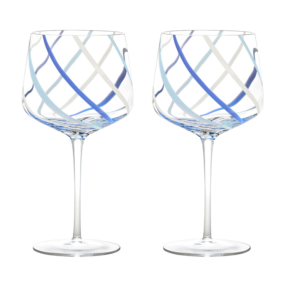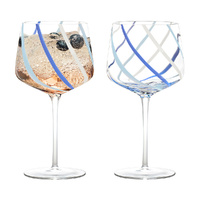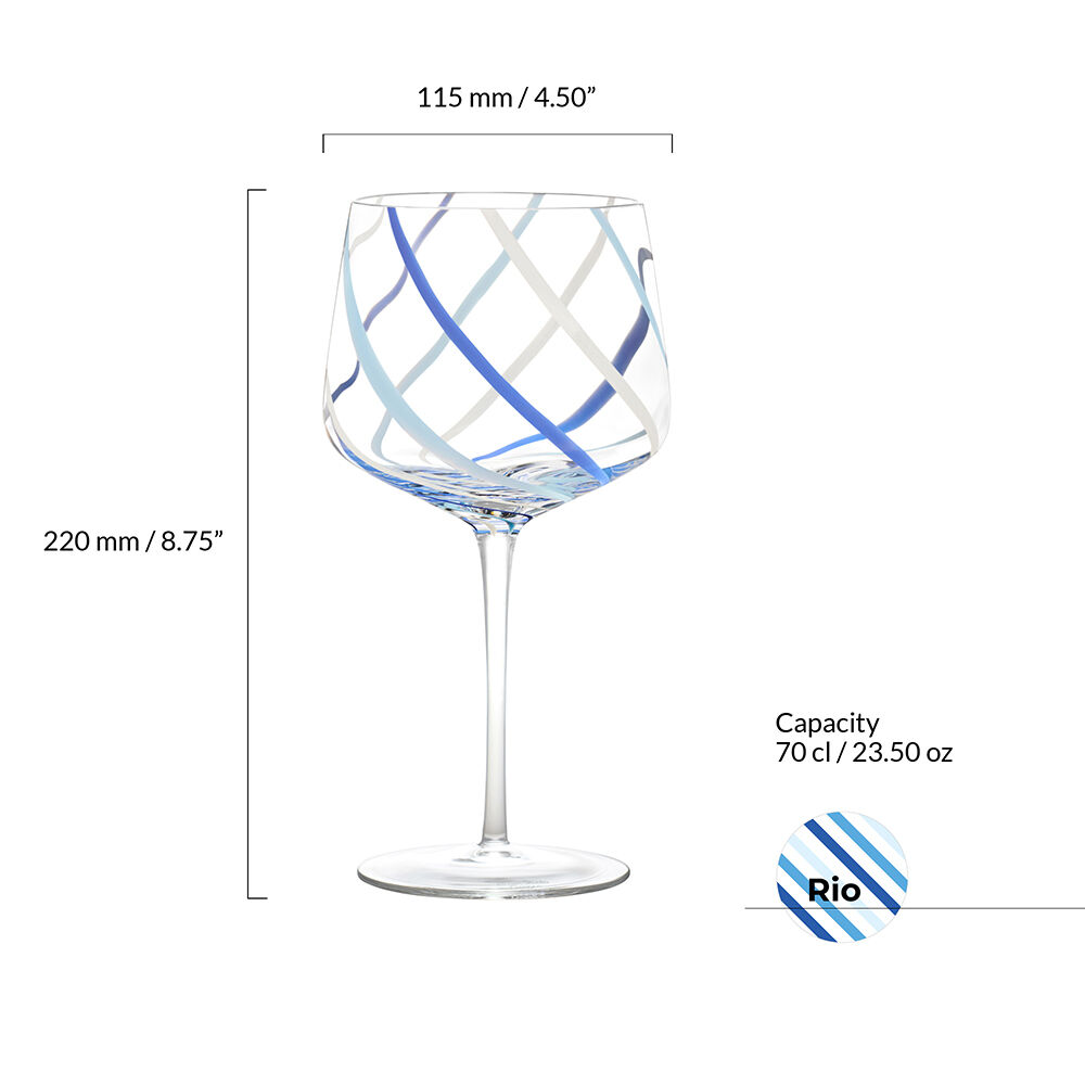 ASD10205 ASD Rio Gin Glasses Azure Set of 2 From the vibrant colours flowing through the bowl to the sleek, sophisticated shapes, the Rio collection embodies modern design with a playful twist. Available in two striking colourways – Azure and Citrus – each piece features bold, hand-applied colour bands that wrap diagonally around the glass, creating a sense of movement and energy. With tall, angled bowls that taper elegantly inward, the collection includes wine glasses, gin glasses, champagne coupes, and DOF tumblers. Each set is gift-boxed in pairs, making them perfect for gifting or adding a fresh pop of colour to your collection. Swirls of colour infused into each glass Well-rounded bowls with, long elegant stems Use it as a centrepiece, wall ornament, or on a sideboard. Mouth blown and handmade by skilled craftsmen Weight: 235 g Dimensions: 115 × 115 × 220 mm Colour: Blue Clear White Capacity: 70 cl Substrate: Glass
