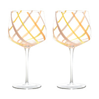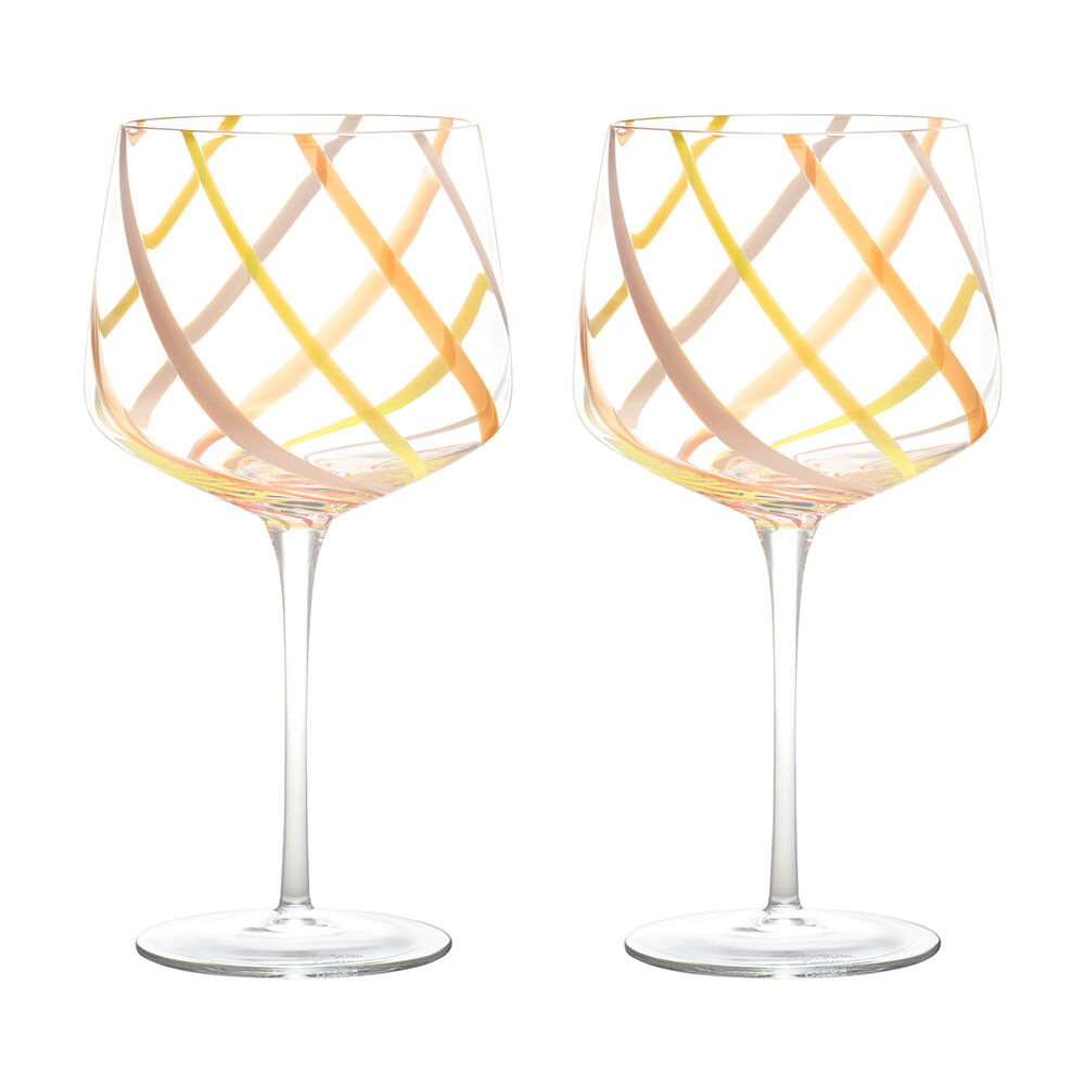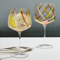 ASD10215 ASD Rio Gin Glasses Citrus Set of 2 From the vibrant colours flowing through the bowl to the sleek, sophisticated shapes, the Rio collection embodies modern design with a playful twist. Available in two striking colourways – Azure and Citrus – each piece features bold, hand-applied colour bands that wrap diagonally around the glass, creating a sense of movement and energy. With tall, angled bowls that taper elegantly inward, the collection includes wine glasses, gin glasses, champagne coupes, and DOF tumblers. Each set is gift-boxed in pairs, making them perfect for gifting or adding a fresh pop of colour to your collection. Swirls of colour infused into each glass Well-rounded bowls with, long elegant stems Use it as a centrepiece, wall ornament, or on a sideboard. Mouth blown and handmade by skilled craftsmen Weight: 235 g Dimensions: 115 × 115 × 220 mm Colour: Clear Orange Pink Yellow Capacity: 70 cl Substrate: Glass