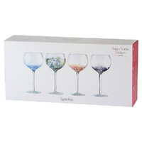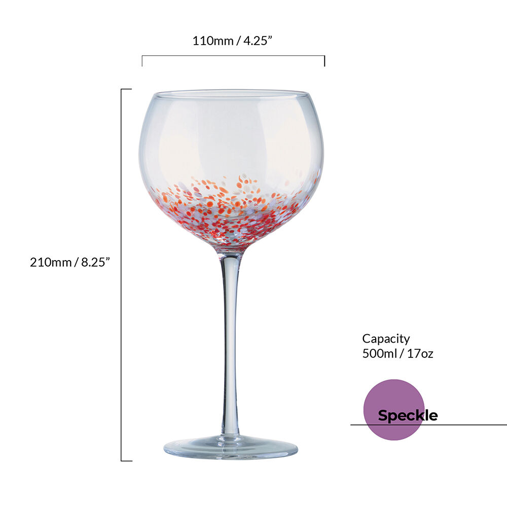 ASD10121 ASD SPECKLE GIN GLASSES (SET 4) Speckle ‘s unique look is created by combining melted colour and white glass beads into the bowl. This mixture of bright and vibrant coloured glass beads, broken up with crisp, white beads creates a beautiful swirl of colours in every piece. With each set containing four different coloured glasses, Speckle is a smart and trendy collection. Each of the four sets are gift boxed and the range comprises champagne flutes, wine glasses, gin glasses and double old fashioned tumblers. Set of 4 different coloured glasses Hand wash recommended Gift Boxed Dimensions: 110 × 110 × 210 mm Capacity: 50 cl Colour: Multi-coloured Substrate: Glass