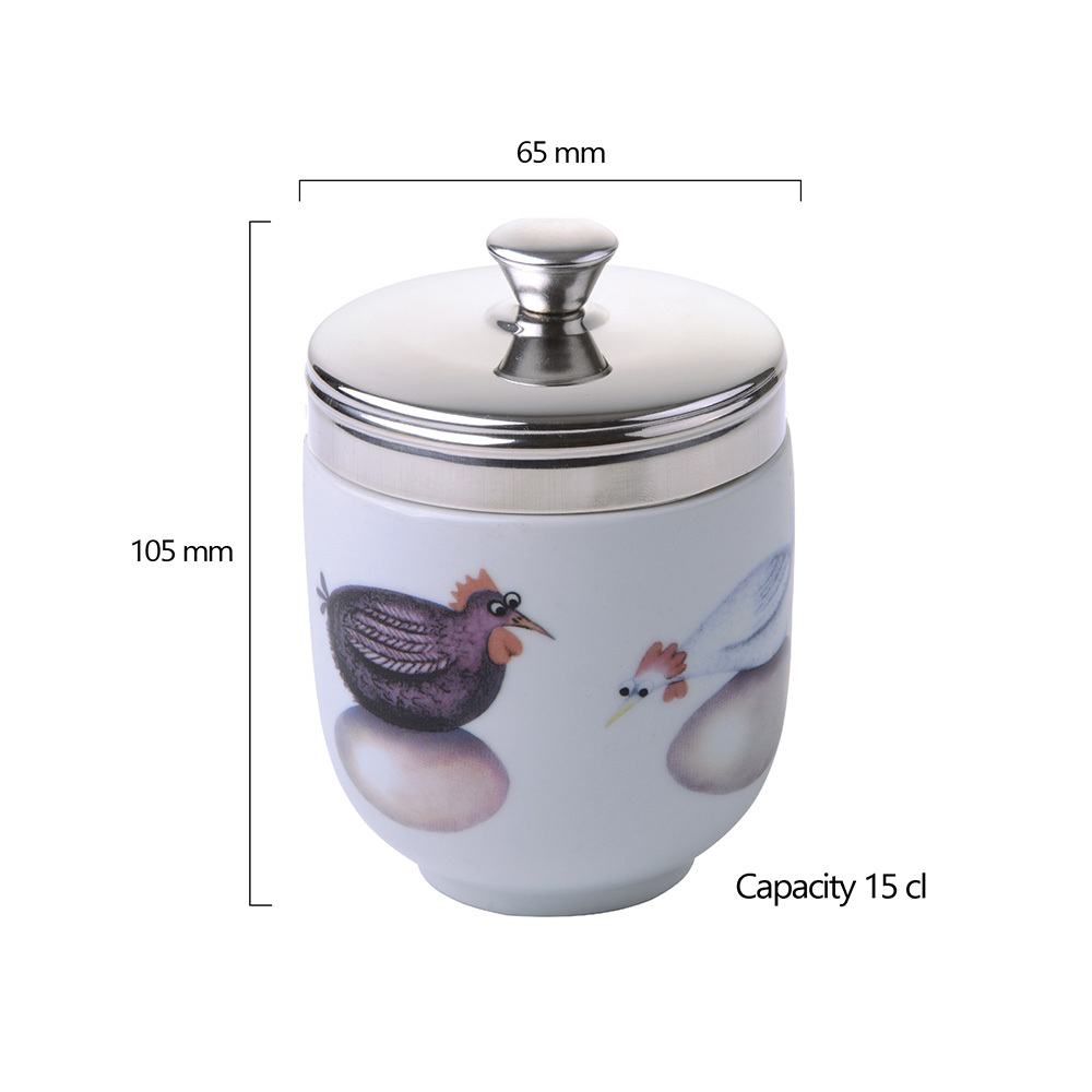 Designed in the UK by multi award winning artist Clare Mackie Each egg coddler comes with a leaflet of serving suggestions instructing how to use your coddler and a few ideas of what to add, like spinach, feta and sun dried tomatoes or asparagus and parma ham! Eggs have become an amazingly popular food as they are an inexpensive way of eating your protein. The egg coddler offers a fabulously simple alternative to spice your eggs! Gift boxed Dimensions: 65 x 65 x 105 mm Capacity: 15 cl Colour: Multi-coloured Material: Porcelain Dishwasher Safe: Yes Oven Safe: No Microwave Safe: No Freezer Safe: No Gift Boxed: No
